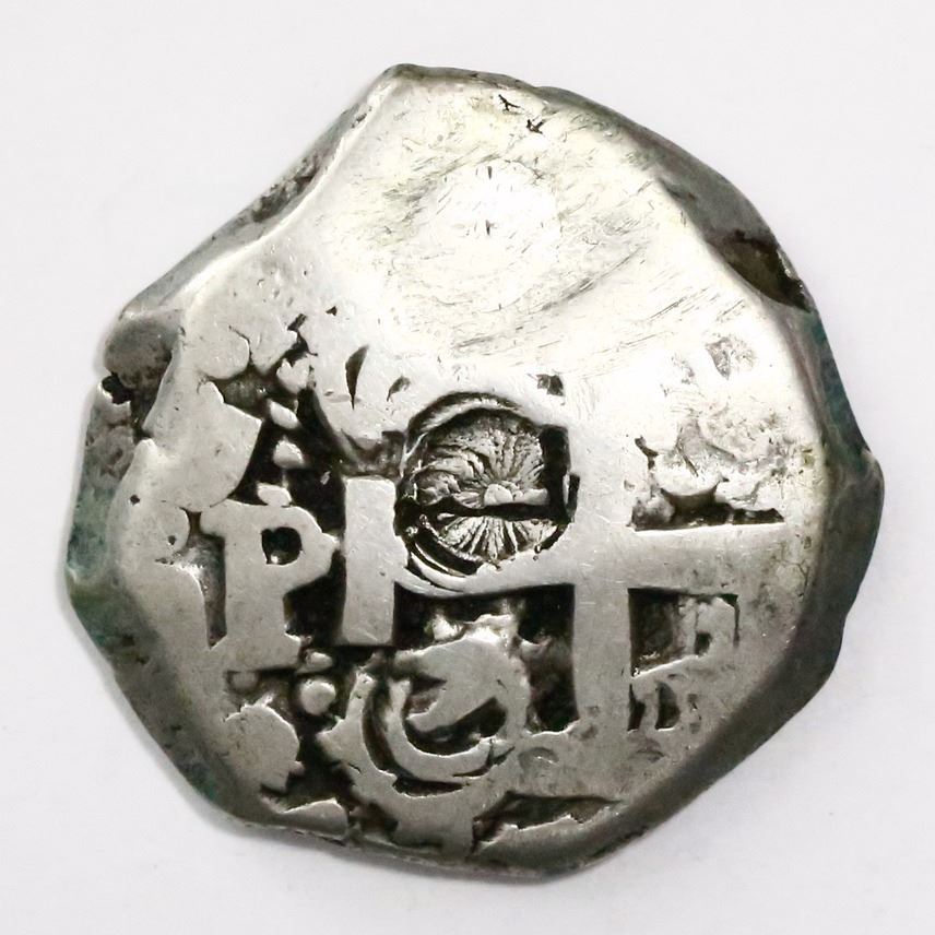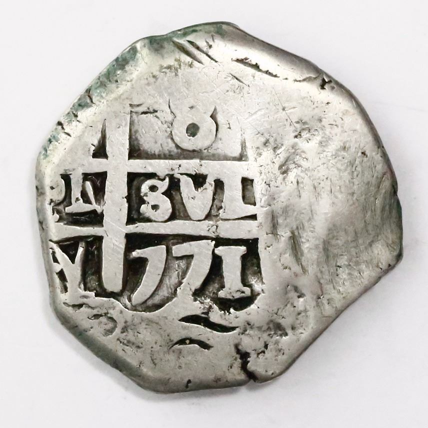 Guatemala, 8 reales, sun-over-mountains countermark (Type II, 1839) on a Potosi, Bolivia, cob 8 reales, 1771(V)-Y. KM-100. 26.34 grams. Crude VF countermark deeply impressed in one quadrant of cross (about 60% visible) with bold mintmark to left, bold date and Y assayer on other side, About Fine with dark toning in crevices, plugged hole at edge. NGC #4446207-010.