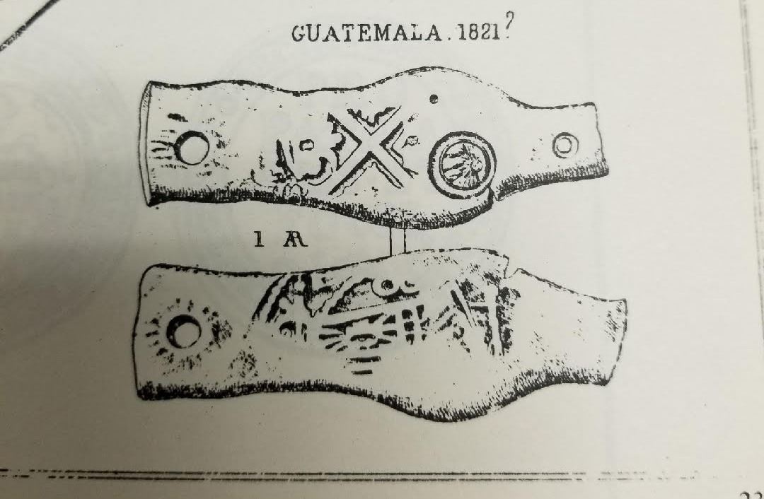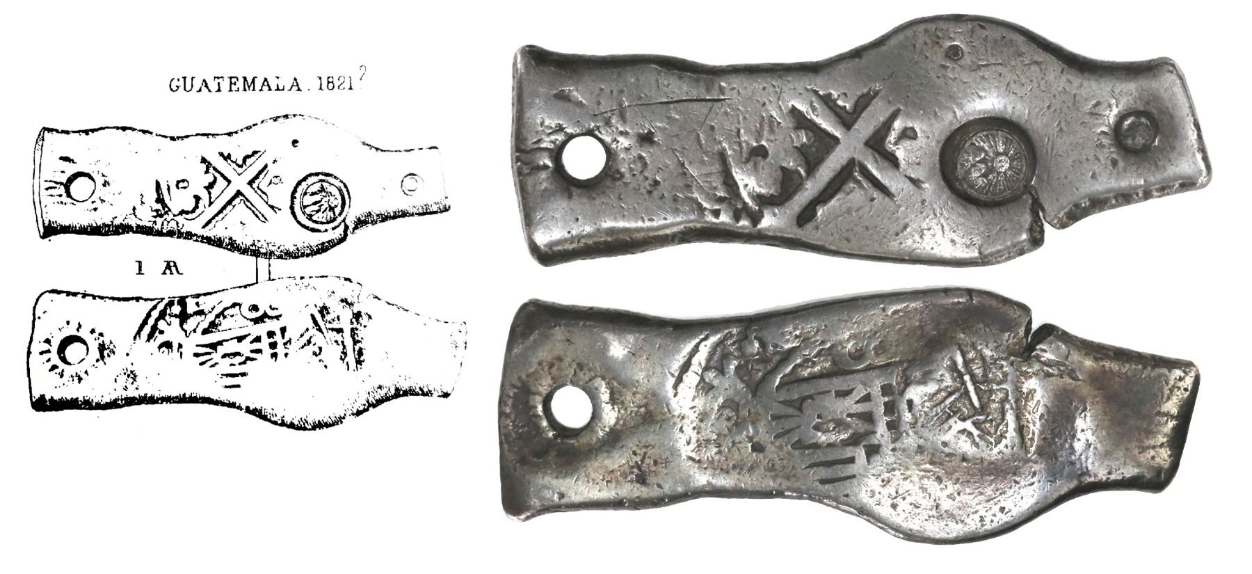 Guatemala, 8 reales, sun-over-mountains countermark (Type II, 1839) on cross side of a Mexico City, Mexico, cob 8 reales, Charles II, assayer not visible, ex-Huntington, Mailliet Plate Coin (1868). KM-unl. 25.95 grams. Just about the longest, thinnest flan we have ever seen on a cob (toned VG), with just enough detail to attribute the king (a combination that is strangely unlisted in KM), but with choice, bold, and deeply impressed countermark (XF) in the only part of the coin that is somewhat round (with consequent crack to edge), tiny punchmark there as well, also with deep punchmark at one end and old hole at other end, a very eye-catching piece that fascinated at least two major collectors in the past 150 years (see pedigree). Pedigreed to the A.M. Huntington collection and plated (line drawing) in Atlas des Monnaies Obsidionales et de Necessite (1868), by Prosper Mailliet.