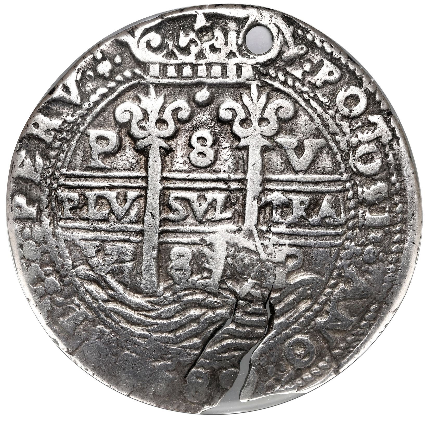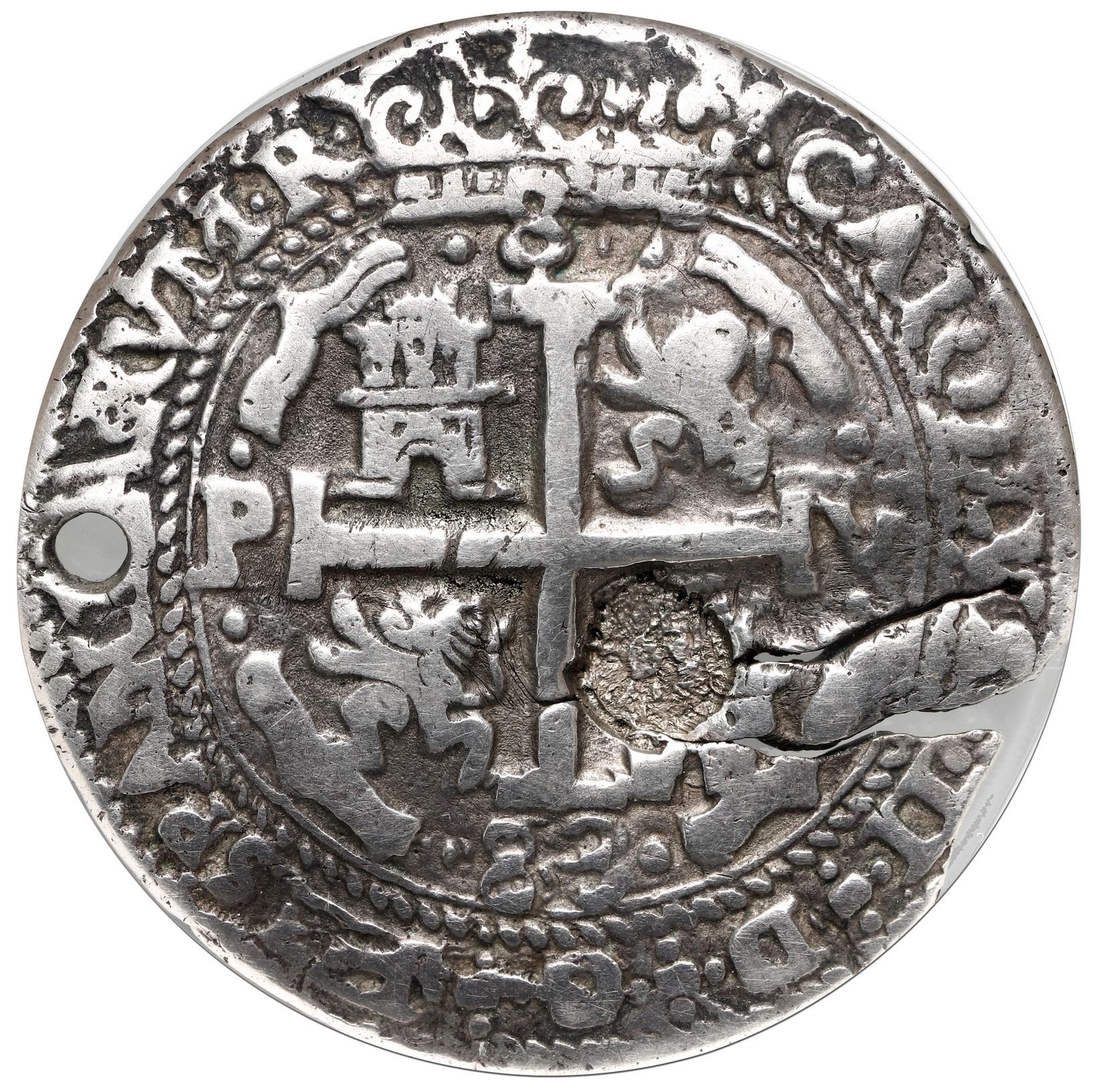 Guatemala, 8 reales, sun-over-mountains countermark (Type II, 1839) on cross side of a contemporary counterfeit Potosi, Bolivia, cob 8 reales Royal (galano), 1683 V, NGC VF details / holed, c/s XF weak. KM-96.1. 24.8 grams. Broad-flan host with cracks to edge from the crude but very deep countermark, holed to left of cross / near top of pillars, attractively toned, cross side appears to be a die-match with Lazaro 210 (rated R2) but Lazaro's pillars side is too doubled to confirm a match. Note: The host coin is actually a circulating contemporary counterfeit cast in the 1800s, prior to the countermarking in 1839 (several examples known with the genuine countermark in different places, for example in Guttag and Elizondo). It was apparently cast from a genuine example with the same cross-side die as Lazaro #210. All of the cast counterfeits have the same diagnostic doubling and misplacement of the T in POTOSI on the pillars side, also with hole in same location on all. Examples in Spanish auctions have been referred to as "Fundición indígena para circular en Centro América con resello." The NGC label does not specifically identify the host as a contemporary counterfeit.