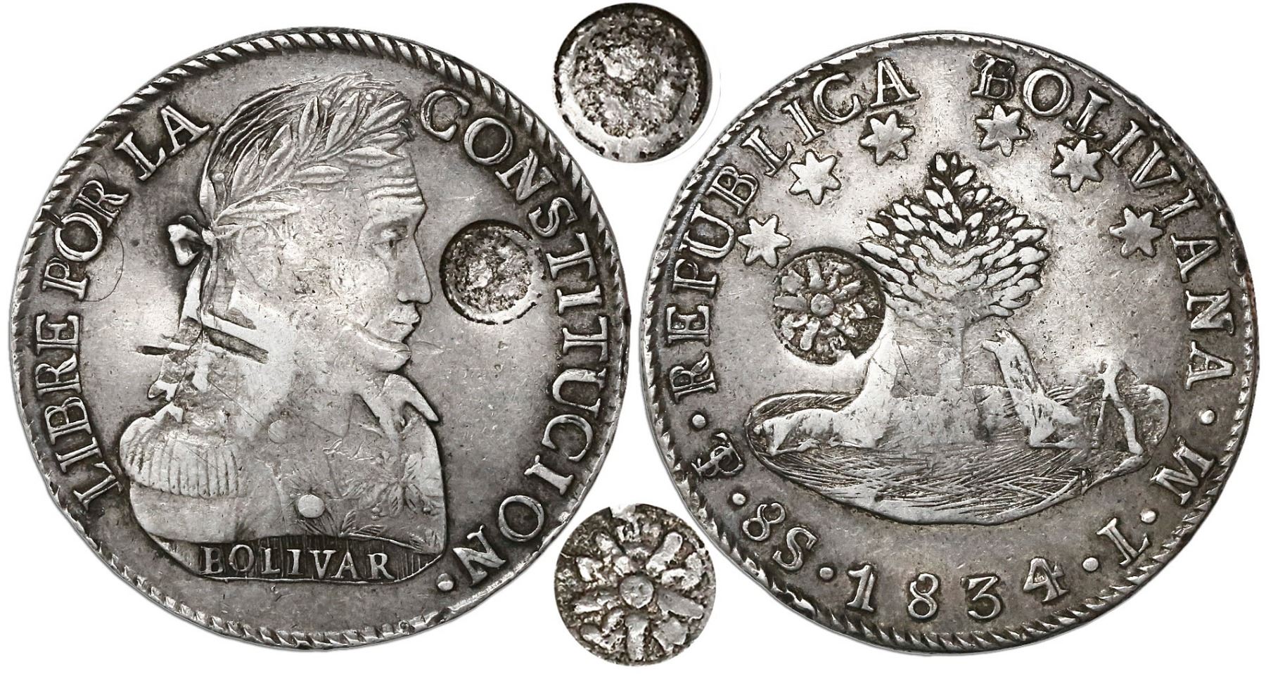Guatemala, 8 reales, sun-over-mountains double countermark (Type III, 1840) on a Potosi, Bolivia, 8 soles, 1834LM KM-114. 26.94 grams. Very crude countermarks (Fine) consisting of sun-over-mountains to right of Bolivar and sunface star with bow and arrows to left of tree, host coin attractively toned AVF with minor old scratches.
