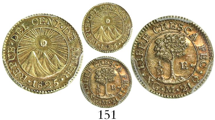 Guatemala (Central American Republic), 1/2 escudo, 1825M, encapsulated PCGS AU58. KM-5. Lustrous and toned, a couple spots of dark sediment, choice grade, fully Mint State in our opinion, popular issue.