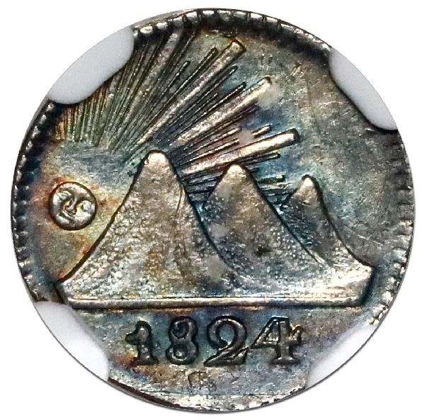 Guatemala (Central American Republic), 1/4 real, 1824, NGC AU 55. KM-1. Bold strike with lovely rainbow toning all over, a few faint marks and traces of wear, slightly crude rims (as made), desirable first date of series. NGC #4724416-001.