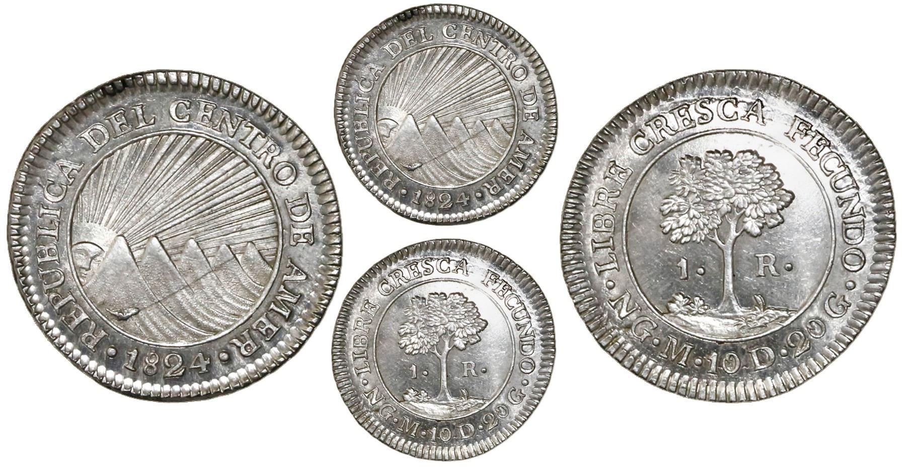 Guatemala (Central American Republic), 1 real, 1824M, PCGS MS65, finest known in PCGS census, ex-Hubbard. KM-3. 3.39 grams. Brilliant luster and choice full details, die-crack across mountains, tops at PCGS with only one finer (MS 67) at NGC. Pedigreed to the Clyde Hubbard collection. PCGS #36269111.
