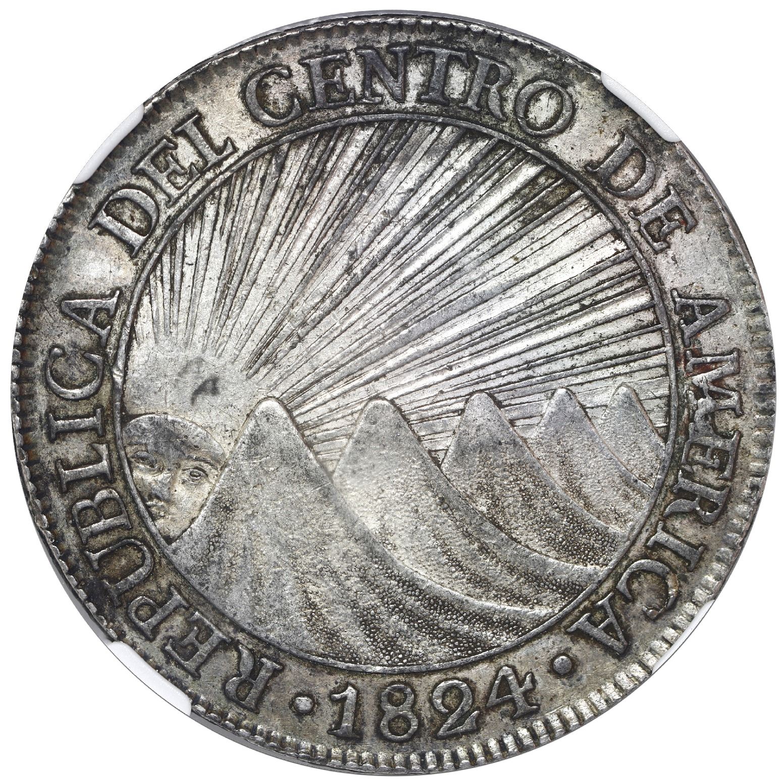 Guatemala (Central American Republic), 8 reales, 1824 M, NGC AU 53. KM-4. Lightly toned over muted luster, well-detailed strike, just a few small marks. NGC #2835978-008.