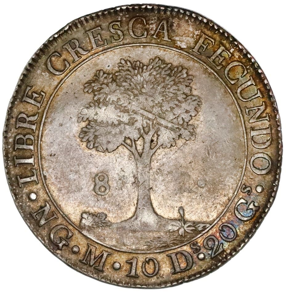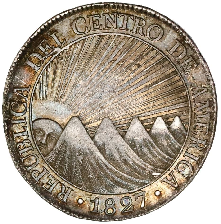 Guatemala (Central American Republic), 8 reales, 1827M, PCGS AU53. KM-4. Attractive light rainbow toning over luster (especially in the legends), with most of this grade's light wear and marks evident on the tree and its leaves (as usual). PCGS #40467641.