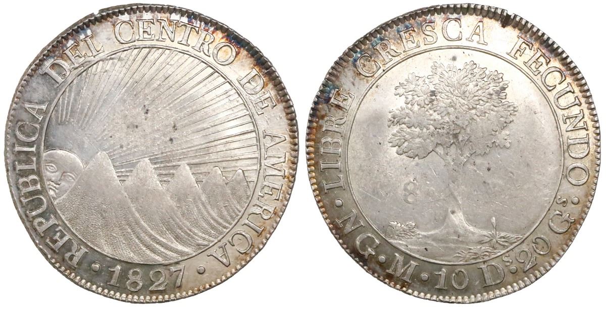 Guatemala (Central American Republic), 8 reales, 1827M. KM-4. 26.84 grams. Highly lustrous AU with nice toning at rims, slightly weak centers, small modern test-cut in tree-side rim.