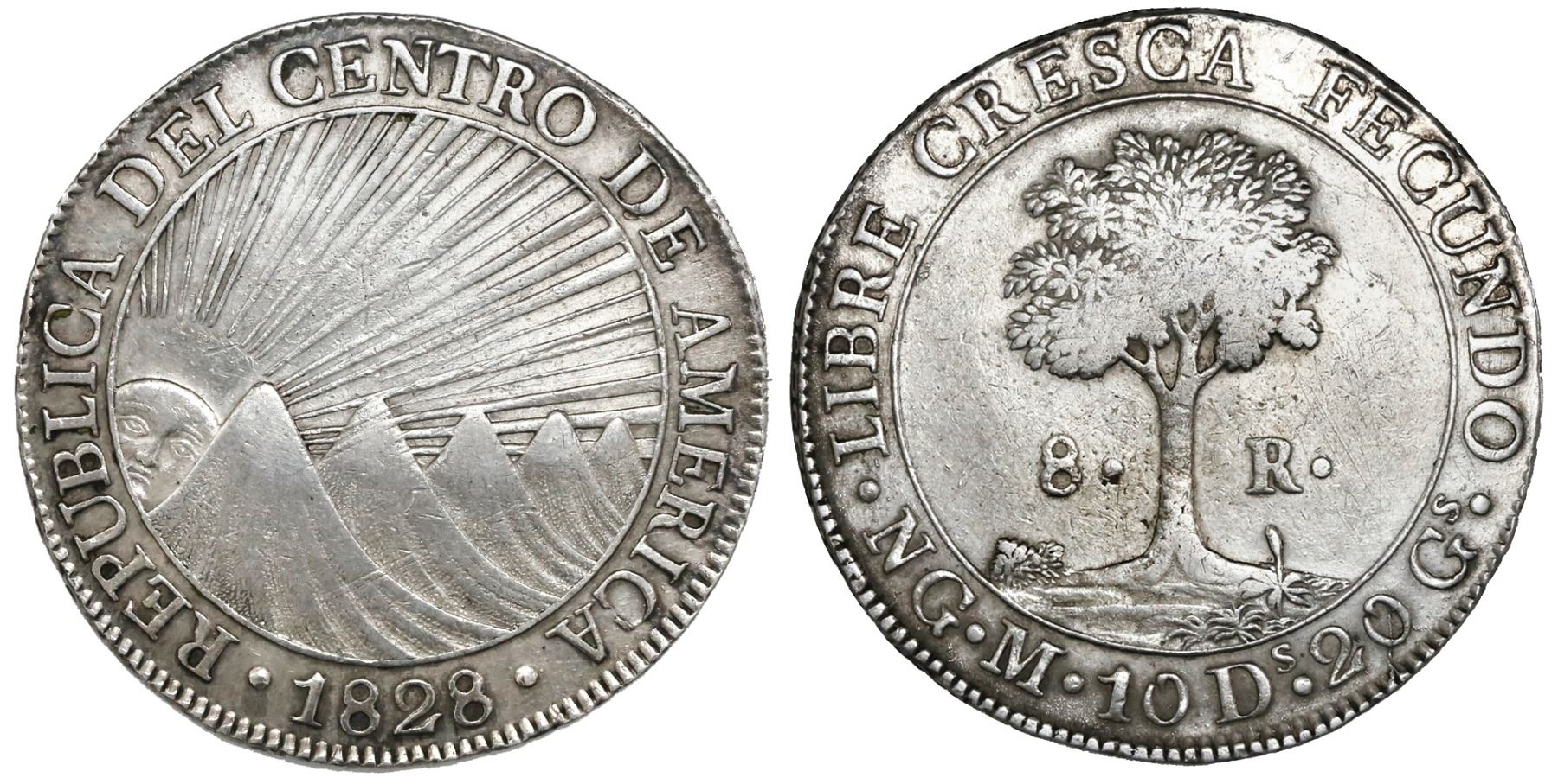 Guatemala (Central American Republic), 8 reales, 1828M. KM-4. 26.76 grams. XF+ with slight central weakness as usual, parts of rims weak (as made).
