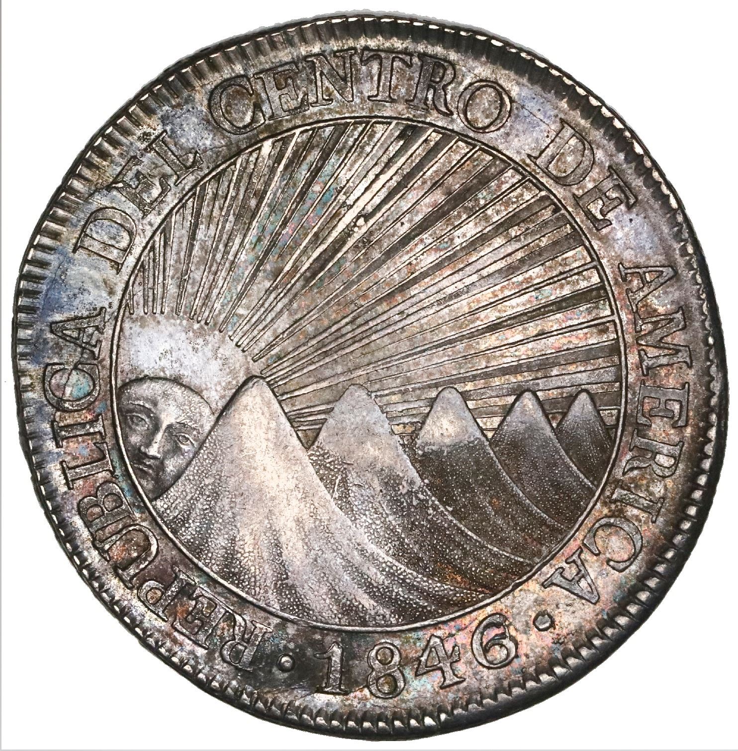Guatemala (Central American Republic), 8 reales, 1846/2AE/MA, CREZCA/CRESCA variety, NGC AU 58+. KM-4. Light rainbow toning over luster, good strike with full leaves, also full rims, but weak on the R to right of tree, second highest grade at NGC. NGC #5938098-027.