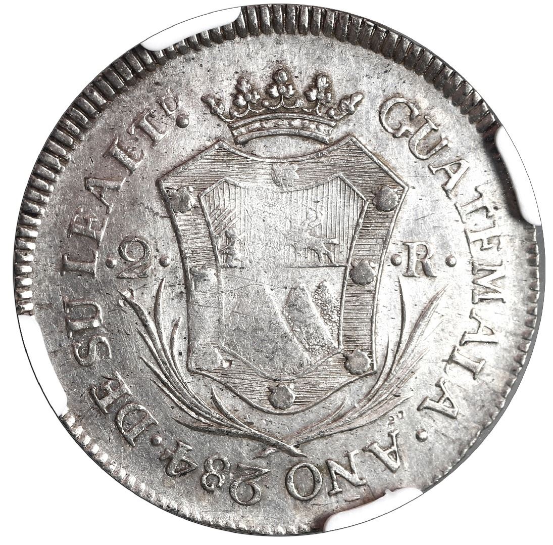 Guatemala City, Guatemala, 2 reales proclamation medal, Ferdinand VII, 1808, by P. Garcia Aguirre, NGC AU 58. Herrera-14; Medina-294; Grove-F57; Cal-789. 27mm. Obverse with bust above P.G.A. inside legend * A * FERNANDO * VII * ANO * 1 * DE SU REYN * / .1808.; reverse with Guatemalan coat of arms inside legend GUATEMALA . ANO 284 . DE SU LEALTD. Lustrous and only lightly handled piece with high points a bit flat from bulging flan (die failure), silvery fields with some dark gray tones. Please use this link to verify the certification number