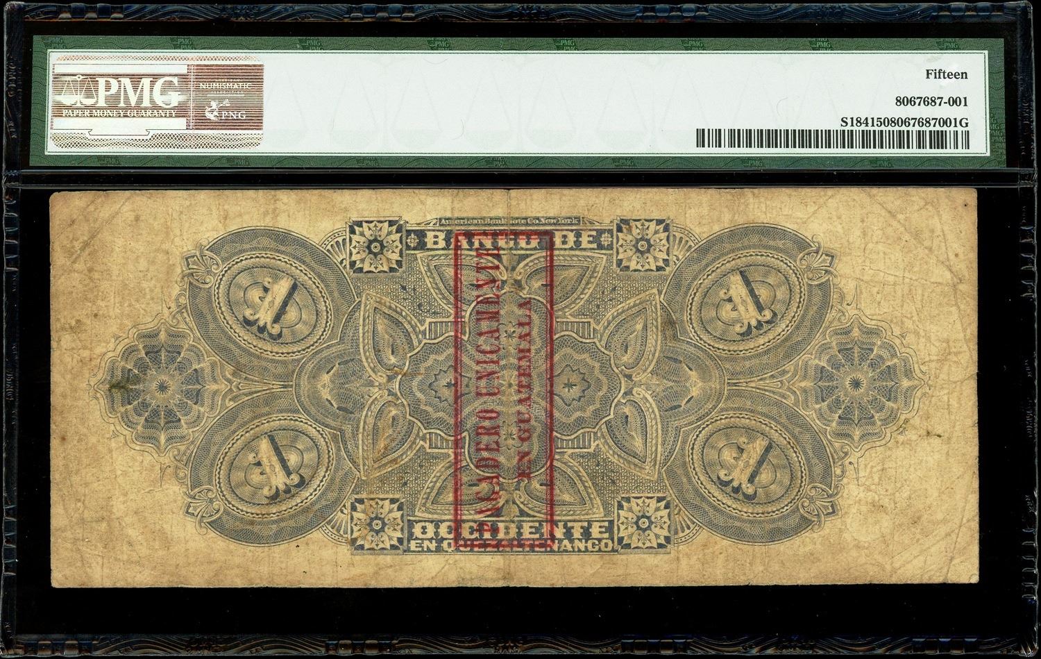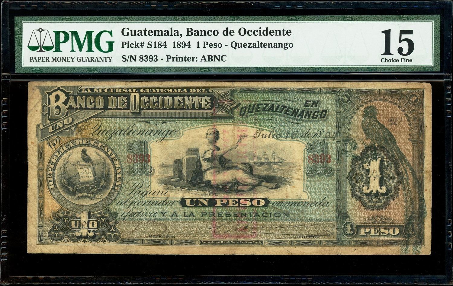 Guatemala City, Guatemala, Sucursal Guatemala del Banco de Occidente, 1 peso, 16-7-1894, serial 8393, with red PAGADERO UNICAMENTE stamp on back, very rare, PMG Choice Fine 15, finest known example in PMG census. SCWPM-S184. Very rare branch issue, similar in design to S173 but with the added LA SUCURSAL GUATEMALA bank title at top on the front and a red PAGADERO UNICAMENTE EN GUATEMALA (payable only in Guatemala) stamp on the reverse. Well circulated yet fully intact with only a pinhole in the upper left corner and a small ink "20" annotation on the front, ink colors still quite bold and clear penned signatures present, unpriced at any level in the Standard Catalog and finest of three graded by PMG (the other two being VG 6 and VG 8). PMG #8067687-001.