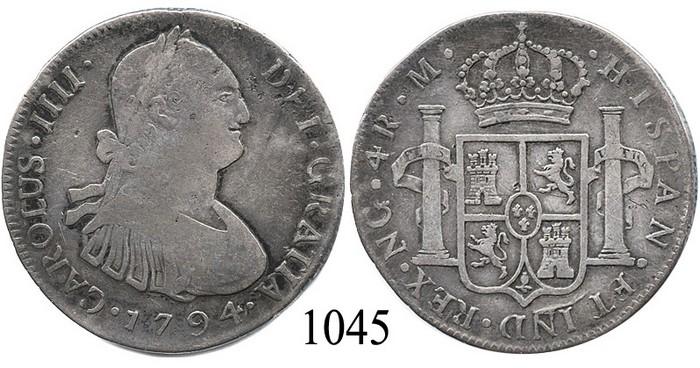 Guatemala City, Guatemala, bust 4 reales, Charles IV, 1794M. KM-52. 13.0 grams. Fine+ with nice old toning all over.