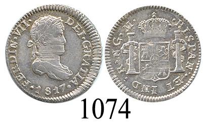 Guatemala City, Guatemala, bust ½ real, Ferdinand VII, 1817M, lustrous AU with adjustment marks. KM-65. 1.8 grams. Highly lustrous AU with slightly weak centers, off-center strike, and adjustment marks on bust, still quite dazzling due to its grade.