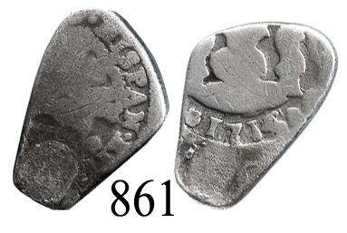 Guatemala City, Guatemala, cob 1 real, 1735/4(J), rare overdate. S-G1. 2.8 grams. Elongated shape, full date with clear 5/4 (unlisted in KM), some bold legend due to poor centering, only Good for wear and with plugged hole.