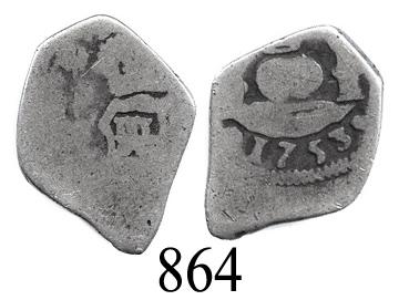 Guatemala City, Guatemala, cob 1 real, 1753(J). S-G1a. 2.2 grams. Choice full date, decent pillars and globes but the rest of the coin weak and worn (Good), no hole.