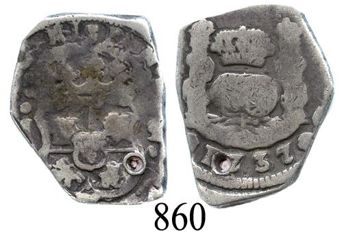 Guatemala City, Guatemala, cob 2 reales, 1737J. S-G1. 6.4 grams. Full central designs (unusual to see that) and date, toned Fine with typical hole (filled with tan sediment).
