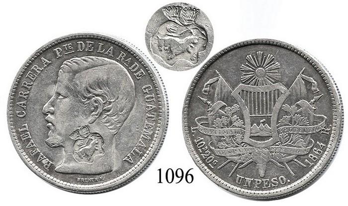 Guatemala City, Guatemala, peso, 1864R, with unidentified crowned-bull(?) countermark on neck.