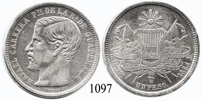 Guatemala City, Guatemala, peso, 1864R. KM-182. 24.4 grams. Lustrous XF with incipient rainbow toning.