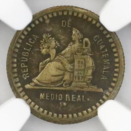 Guatemala, brass trial strike or pattern 1/2 real, 1890, NGC XF 45, ex-Richard Stuart (stated on label), finest and only known example in NGC census. KM-unl (cf. 155.2). Very rare piece of the same design for the silver medio real but in brass. Appears to have circulated or been handled a bit with even wear throughout and contrasting dark toned fields. Pedigreed to the Richard Stuart collection. NGC #4825020-009.