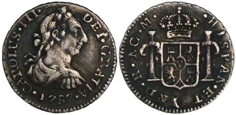 Guatemala, bust 1/2 real, Charles III, 1787M. KM-32.2a; CT-1686. 1.65 grams VF, light friction wear over high features, dark toning in lower points, slightly off-center strike.