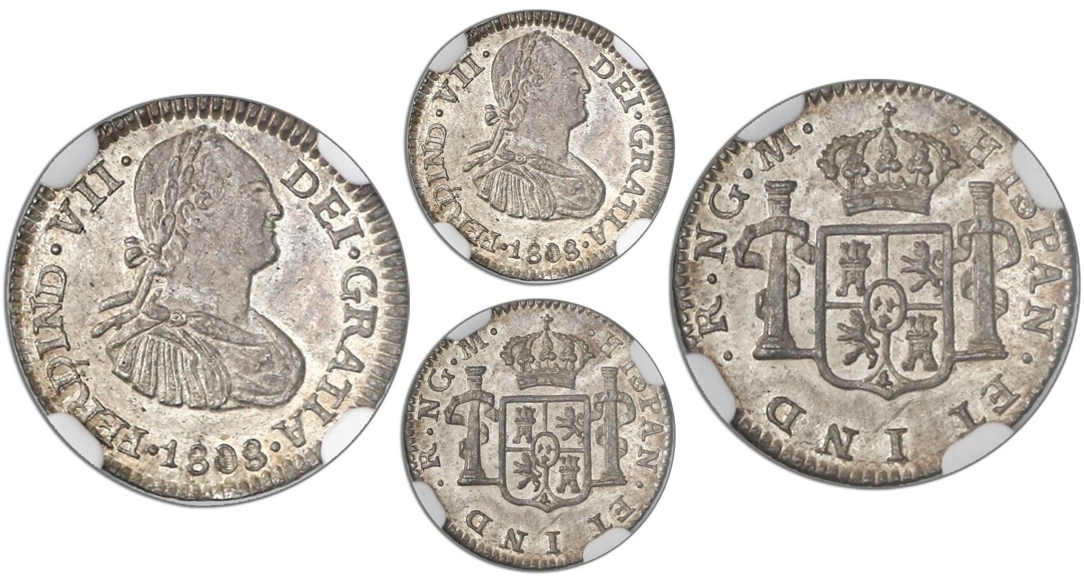 Guatemala, bust 1/2 real, Ferdinand VII transitional (bust of Charles IV), 1808M, NGC MS 65, ex-Richard Stuart (stated on label). KM-60; CT-1279. Choice bold strike with nice luster and very light toning, second finest in NGC census behind a single MS 66. NGC #4427859-009. Pedigreed to the Richard Stuart collection.