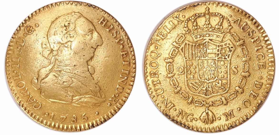 Guatemala, bust 2 escudos, Charles III, 1785M, rare. CT-414; KM-38. 6.61 grams. Decent VF+, once mounted in jewelry but no obvious damage except for a small pockmark at top of shield, rare two-year type.