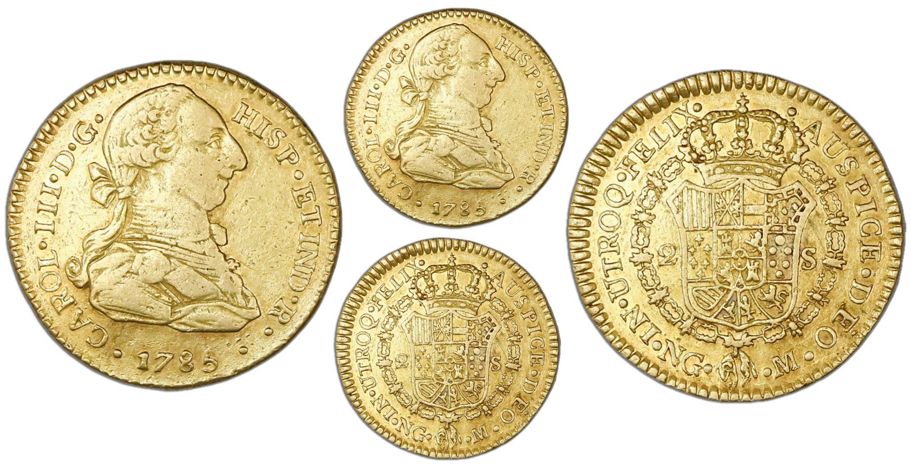Guatemala, bust 2 escudos, Charles III, 1785M, rare. CT-414; KM-38. 6.72 grams. Problem-free XF with muted luster, desirable specimen, typically rare and highly sought like all Guatemala colonial gold.