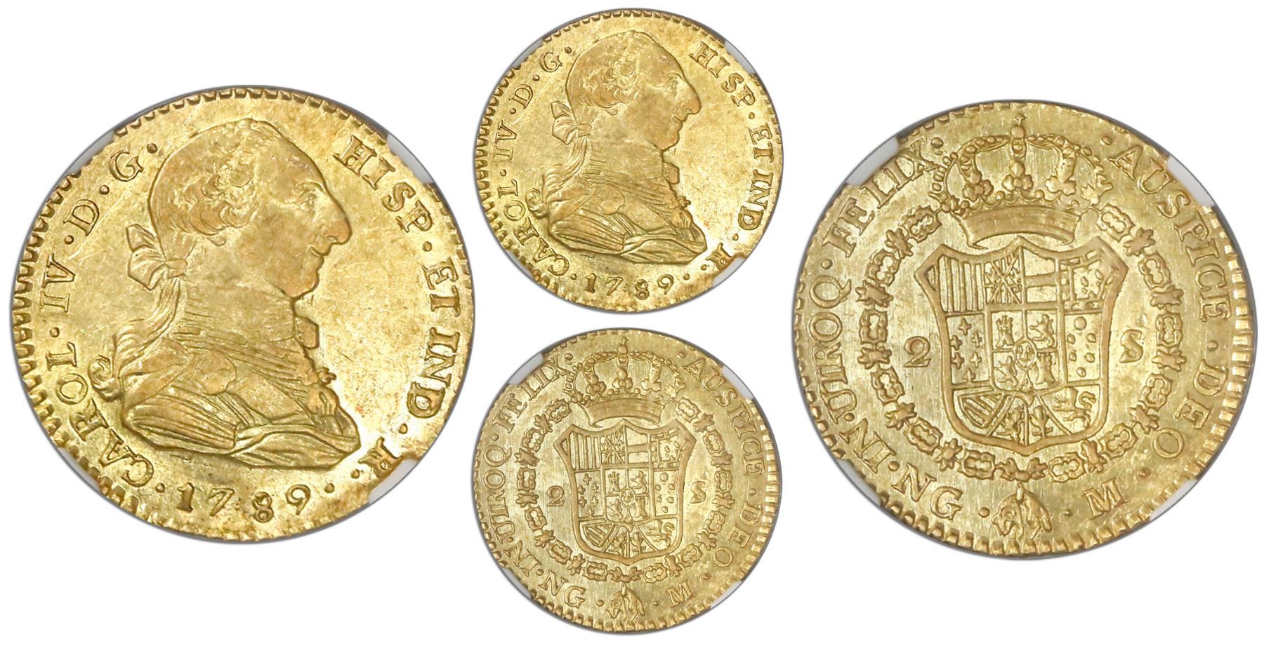 Guatemala, bust 2 escudos, Charles IV transitional (bust of Charles III, ordinal IV), 1789M, rare, NGC AU 55, finest known in NGC census. CT-299; KM-47. Choice luster and strike, minor hairlines and high-point wear only, worthy of its status as finest in the census by six grades, an exceptional example for Guatemala colonial gold (which is all rare and desirable). NGC #4495904-001.