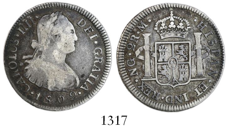 Guatemala, bust 2 reales, Charles IV, 1802M. CT-925; KM-51. 6.65 grams. Deeply toned Fine+, no problems.