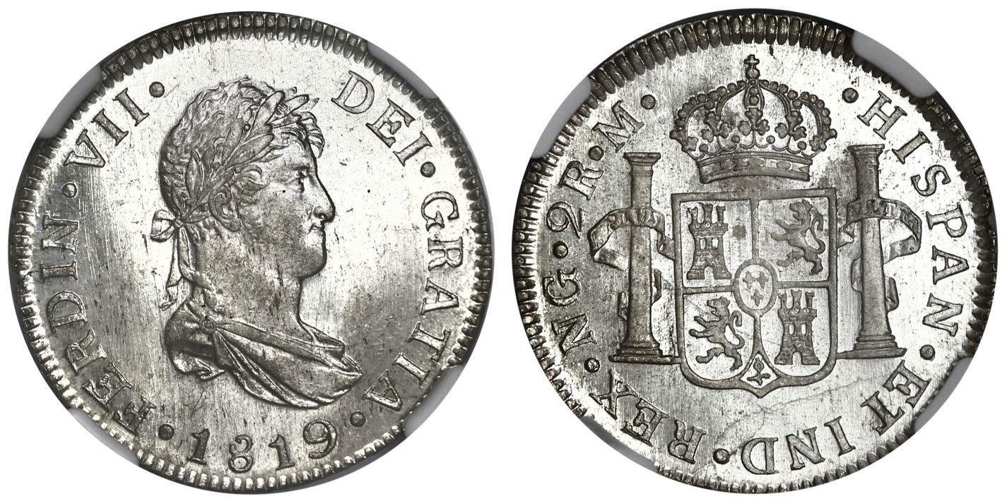 Guatemala, bust 2 reales, Ferdinand VII, 1819M, NGC MS 65*, ex-Hubbard.