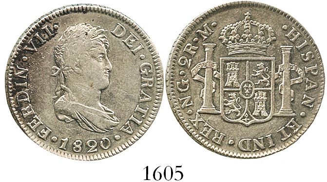 Guatemala, bust 2 reales, Ferdinand VII, 1820M. KM-67. 6.8 grams. Lustrous but lightly cleaned AU- with encrustation in king's name and ordinal.