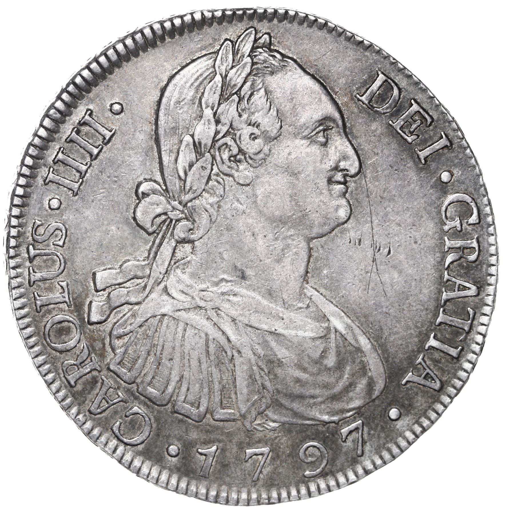 Guatemala, bust 8 reales, Charles IV, 1797 M. JP-8R63b; KM-53; Cal-890. 26.98 grams. Richly toned XF+ with thin scratch in front of bust. With collector's envelope from the 1950s.