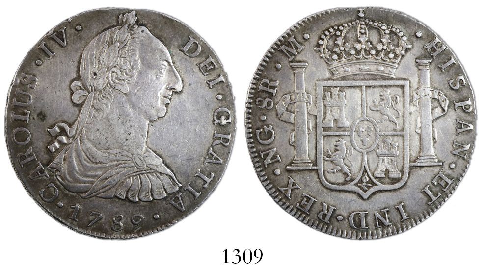Guatemala, bust 8 reales, Charles IV transitional (bust of Charles III, ordinal IV), 1789M, rare. CT-617; KM-45. 27.00 grams. Richly toned AU with underlying luster, faint adjustment marks in center of reverse, top edge slightly crude (as made).