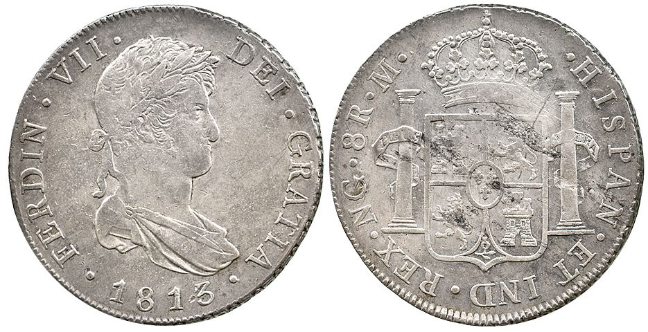 Guatemala, bust 8 reales Ferdinand VII, 1813M. KM-69; CT-461. 26.8 grams. Weakly struck AXF with luster underneath toning, surface laminations on reverse.