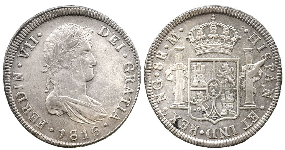 Guatemala, bust 8 reales Ferdinand VII, 1816M. KM-69; CT-464. 26.8 grams. Highly lustrous AU with light toning, off-center obverse, cud near top of right pillar.