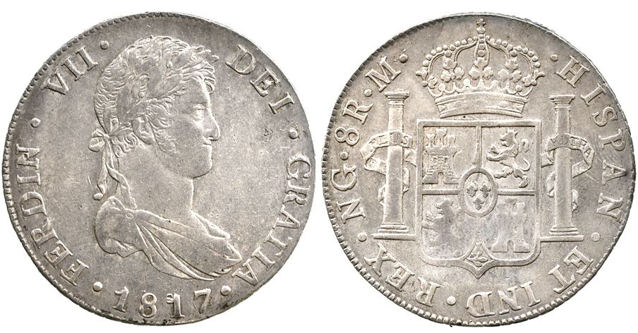 Guatemala, bust 8 reales Ferdinand VII, 1817M. KM-69; CT-465. 26.9 grams. Nicely toned XF with underlying luster, weak rims.