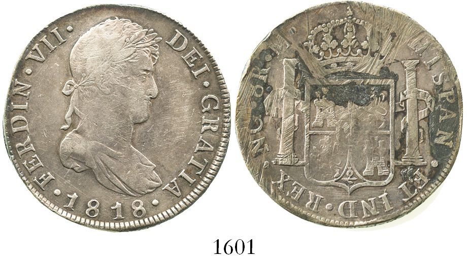 Guatemala, bust 8 reales, Ferdinand VII, 1818M. KM-69. 26.7 grams. Toned AXF with significant damage on reverse (scrapes and encrustation).