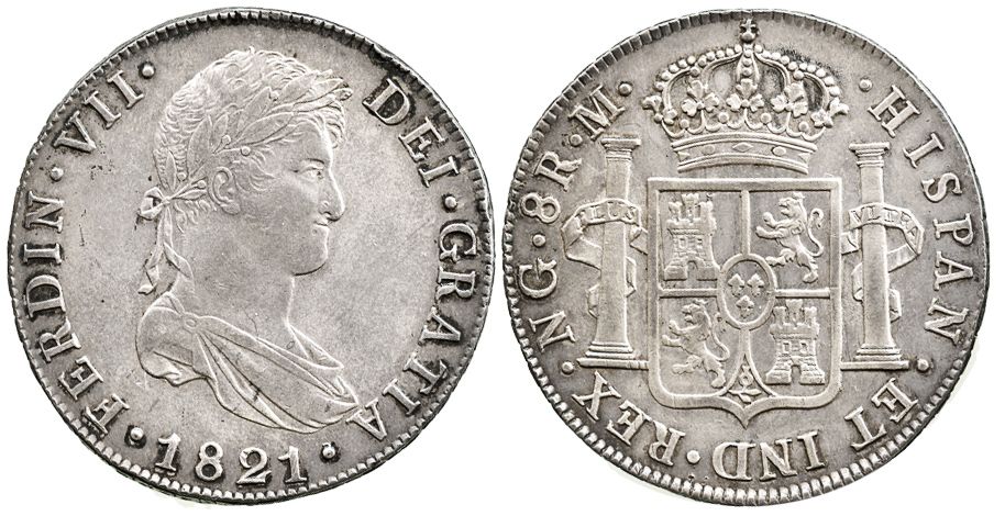 Guatemala, bust 8 reales Ferdinand VII, 1821M. KM-69; CT-470. 26.8 grams. Well-struck AU- with choice toning and luster.