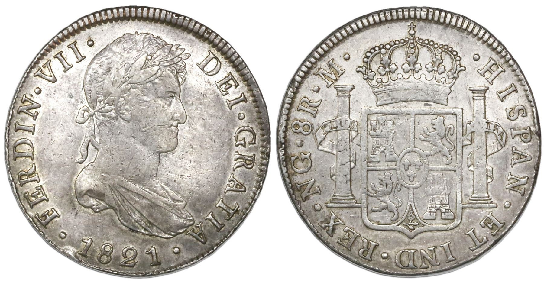 Guatemala, bust 8 reales, Ferdinand VII, 1821M. CT-470; KM-69. 26.81 grams. AXF with some luster, very lightly toned, rim-bruise below date.
