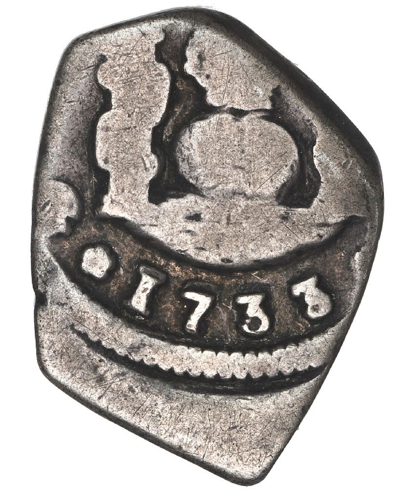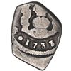 Guatemala, cob 1 real, 1733 J, rare. JP-1R1b; S-G1; KM-3; Cal-354. 3.20 grams. Off-center pillars with 100% full and bold date (rare first year of issue), VG with deeply toned fields, no hole. Pedigreed to the Antigua collection.