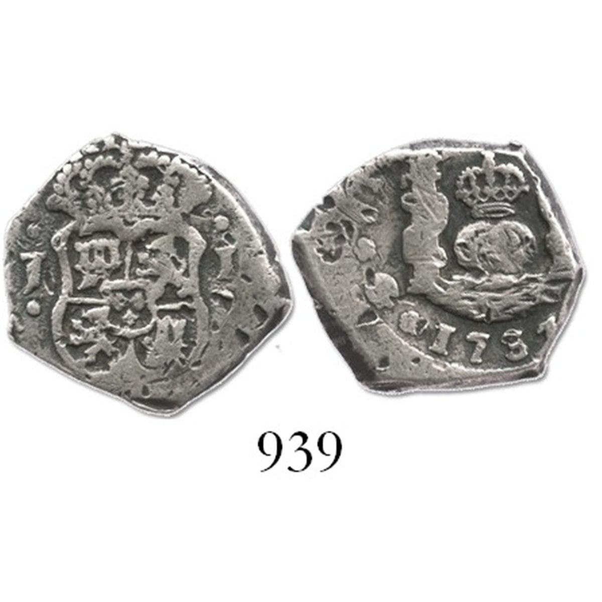 Guatemala, cob 1 real, 1737J. S-G1; KM-3; CT-1459. 3.4 grams. Choice, high-grade specimen (bold VF+) with full date, mintmark assayer and denomination, full and well-centered crowned shield, off-center pillars, nicely toned, a few old marks.