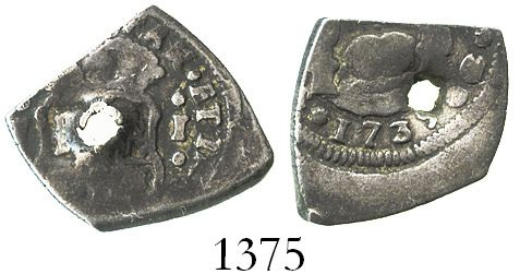 Guatemala, cob 1 real, 1739J. S-G1; KM-3. 2.4 grams. Richly toned and relatively high grade (AVF) but with crude, squarish hole near center, good details.