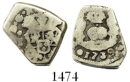 Guatemala, cob 1 real, 1739J. S-G1; KM-3 ;CT-1461. 2.70 grams. Bold full date below well-centered pillars, full shield on other side with clear assayer, About Fine with toned fields, no hole (scarce).