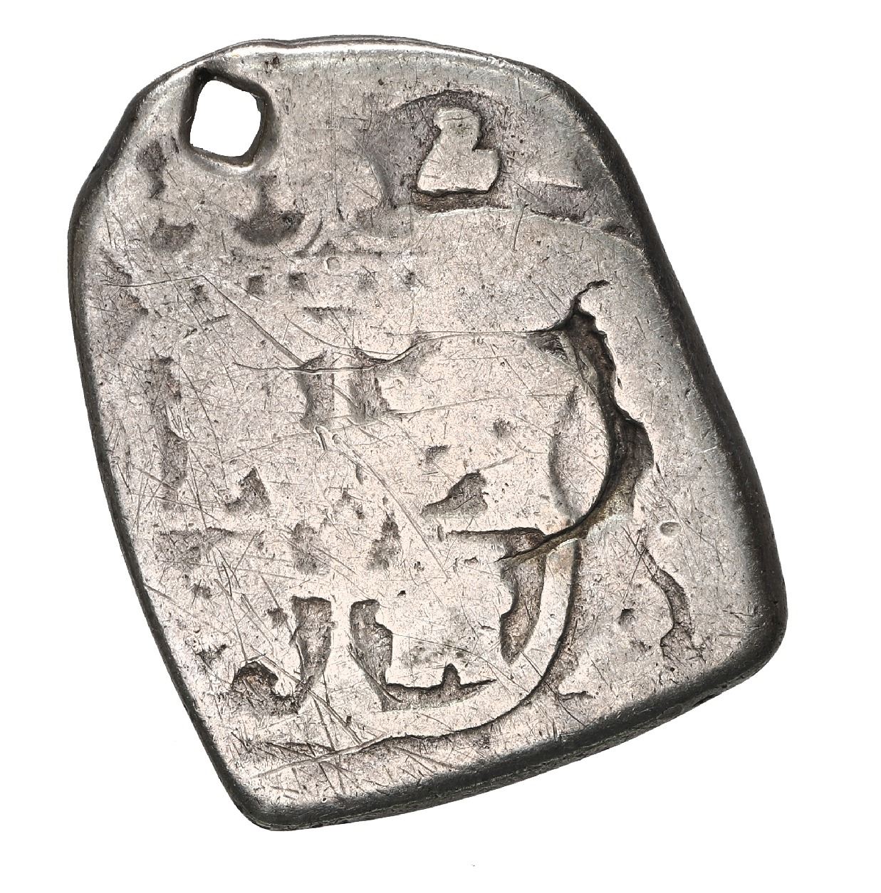 Guatemala, cob 2 reales, 1735 (J), unique error with shield side struck over earlier pillars side. JP-2R3b var; S-G1; KM-4; Cal-679. 6.05 grams. Full 735 of date, full shield with part of globe and one pillar visible above bold 17 of date on that side (either a bold flipover double-strike or a restrike with the coin flipped), Good with hole at top, light toning. Pedigreed to the Antigua collection.