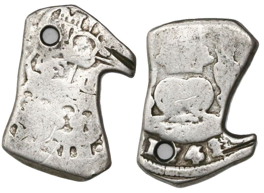 Guatemala, cob 2 reales, 1741/39(J), rare, ex-Richard Stuart. S-G1; CT-unl (type 200); KM-unl (type 4). 6.46 grams. Odd bird-head shape with strategically placed hole (eye) and scratches (beak), bold date with clear overdate (first specimen we have seen) that gives this coin numismatic value beyond its novelty attraction, VG+. Pedigreed to the Richard Stuart collection.