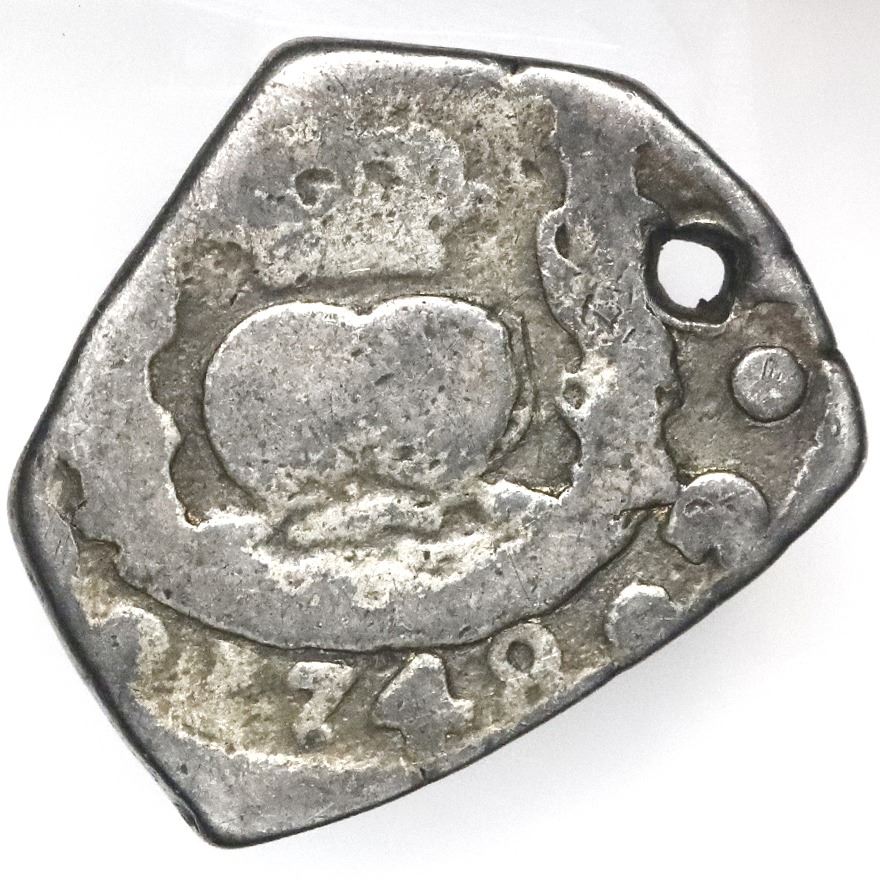 Guatemala, cob 2 reales, 1748J, ex-Jones. S-G1a; Cal-245; KM-10. 6.36 grams. About Fine with nice full date and clear assayer, holed and previously gilded Pedigreed to the Dr. Peter Jones collection.