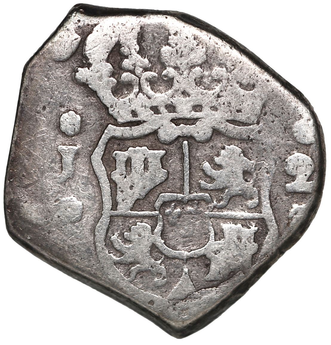Guatemala, cob 2 reales, 1752 J. JP-2R20; S-G1a; Cal-249; KM-10. 6.70 grams. Relatively large flan with choice full crown-globes-waves above bold full date (with old scratches), also full mintmark and assayer and denomination as well as a well-centered full shield, no hole, VF with contrasting toning.