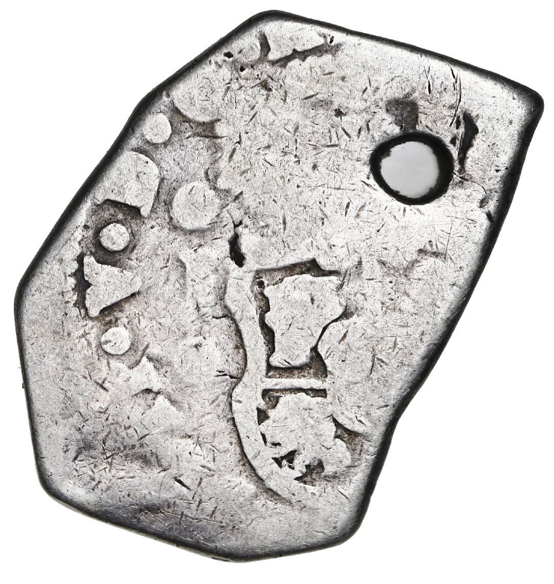 Guatemala, cob 4 reales, 1743J, very rare. S-G1; Cal-1015; KM-5; JP-4R11b. 12.81 grams. Broad flan with full and clear date and mintmark, assayer and king's ordinal V, off-center VG with nice toning, crude hole near one point, missing in many important collections. Pedigreed to the Antigua collection.
