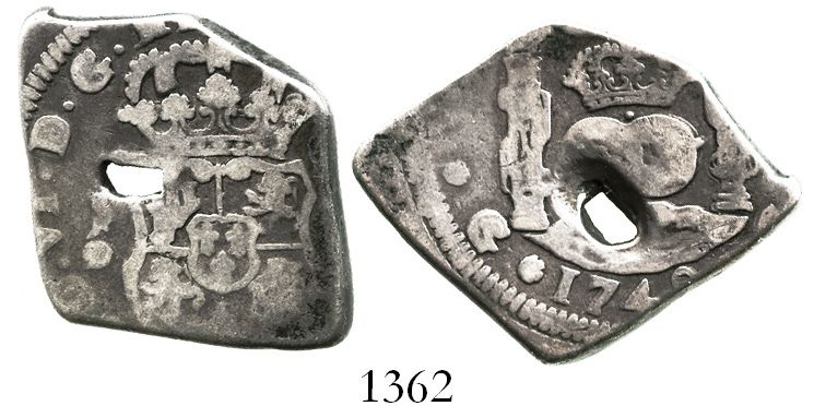 Guatemala, cob 4 reales, 1748J. S-G2; KM-11. 12.8 grams. Interestingly diamond-shaped, with clear date below off-center pillars-and-worlds, full crown and shield and assayer on other side, richly toned AVF, with natural bubble-hole in center but no post-minting hole.