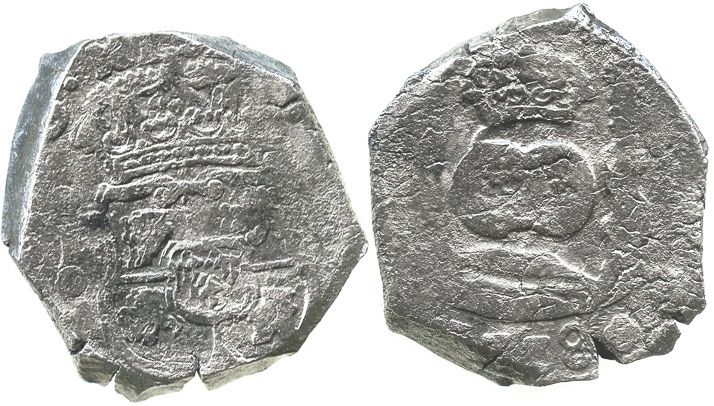 Guatemala, cob 8 reales, (1)738J. S-G1; KM-6; CT-596. 25.5 grams. Solid, thick, roundish flan with nearly full pillars/worlds/waves and crowned shield, full 38 of date, darkly toned, light surface corrosion, tiny edge-split. Recovered from: Reijgersdaal, sunk in 1747 off South Africa
