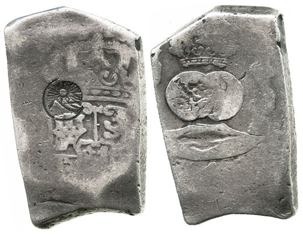 Guatemala, cob 8 reales, (1)745(J), with Type II countermark of 1843 (sun-over-mountains), very rare host date. S-G1; KM-6; CT-605. 26.7 grams. Small, thick, rectangular flan with bold worlds, full and bold countermark on other side, the date weak but with tops of digits certain, nicely toned Fine, also rare as unholed.